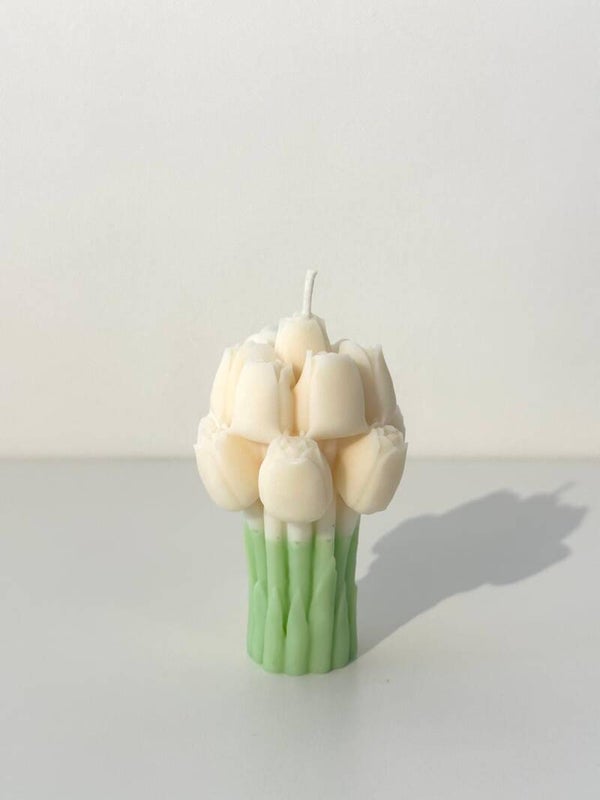 Dit schattige boeketje met tulpen is volledig gemaakt uit kaars (koolzaadwas).